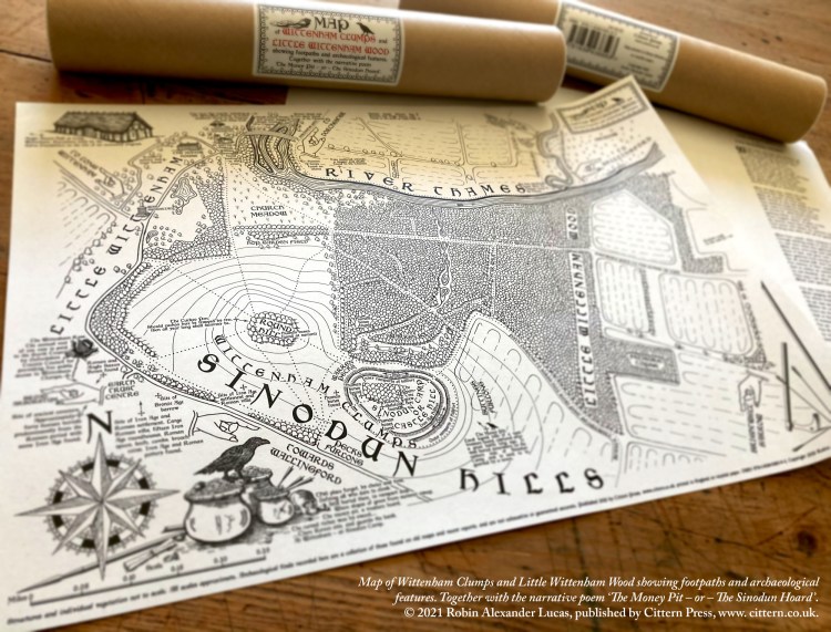 The SECOND EDITION Map of Wittenham Clumps and Little Wittenham Wood showing footpaths and archaeological features, together with the poem ‘The Money Pit – or – The Sinodun Hoard’, by Robin Alexander Lucas, available now. ISBN 978-1-8384385-8-6. Printed on 170gsm paper. Map rolled in a tube, 59.4cm x36.4cm.