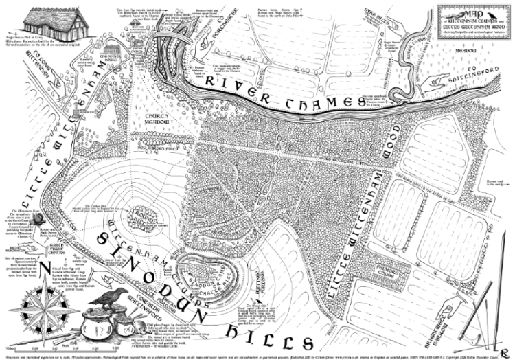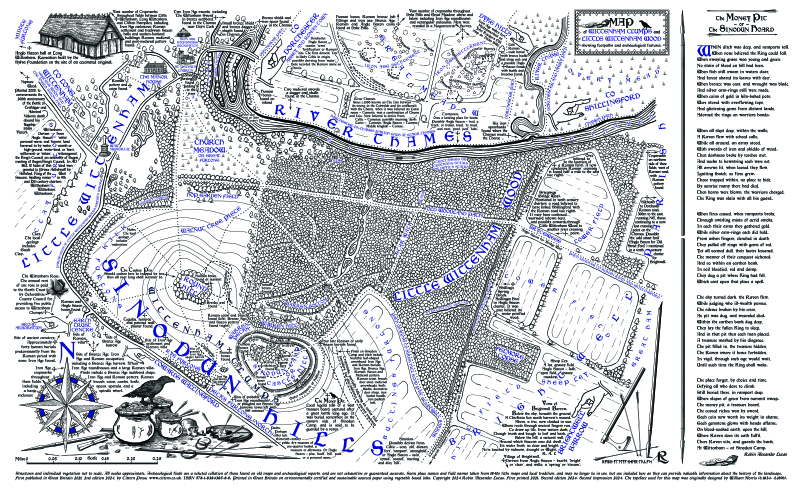 Map of Wittenham Clumps and Little Wittenham Wood showing footpaths and archaeological features, together with the narrative poem ‘The Money Pit – or – The Sinodun Hoard’.